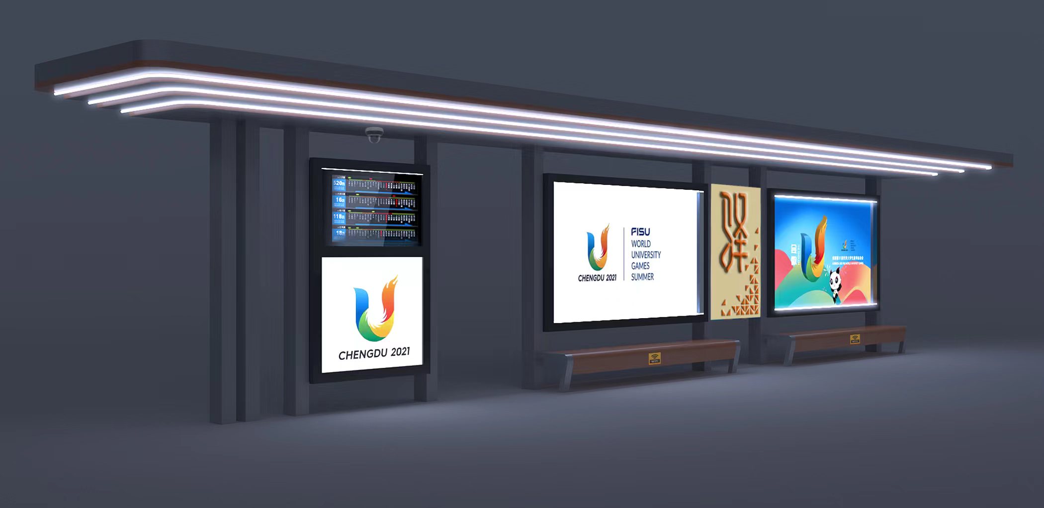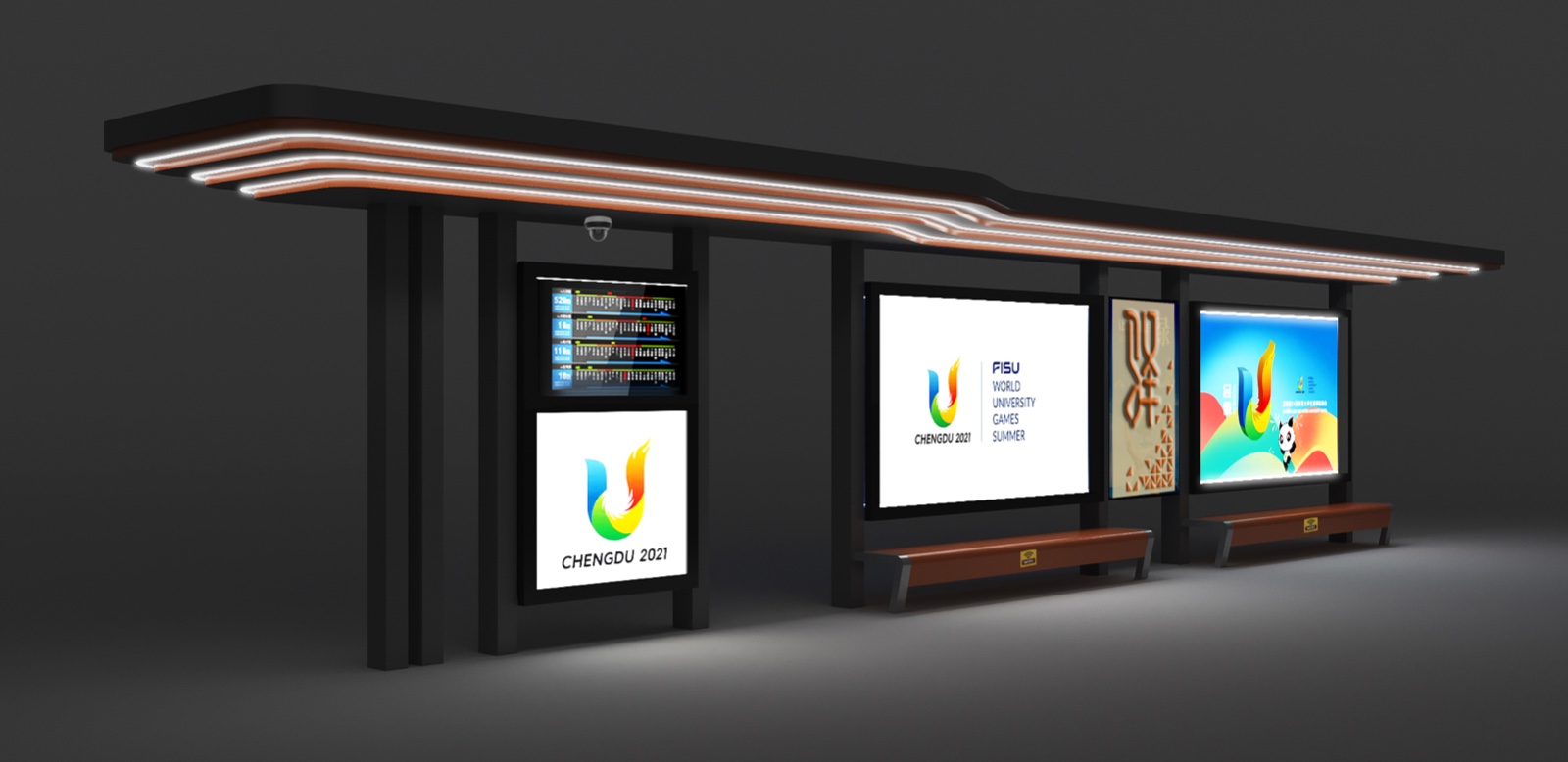 由我公司承建的四川蒲江朝陽大道、鶴山北路城市道路空間一體化改造項目--智慧公交站臺工程圓滿完工,造型呈一字形公交站亭,頂棚融入LED氛圍燈照明、每座站臺實現安全監控、電子報站、座凳充電、地域特色LOGO。