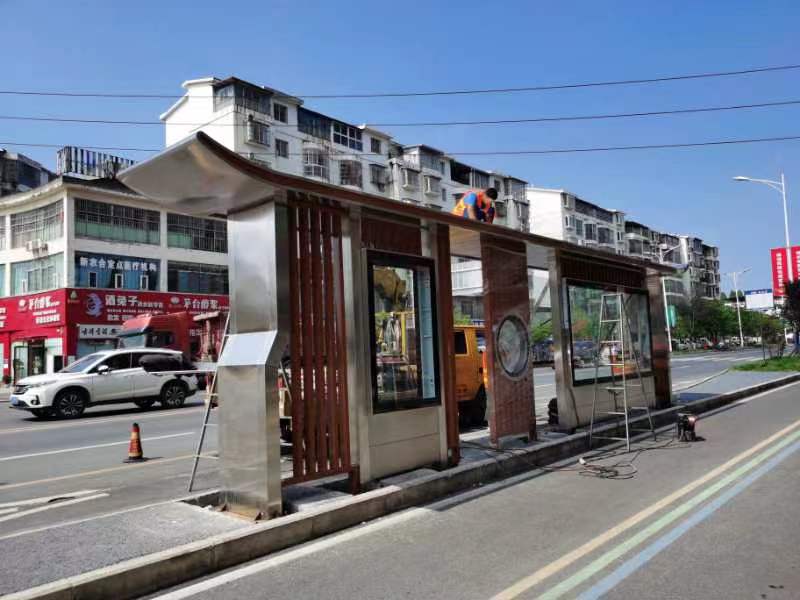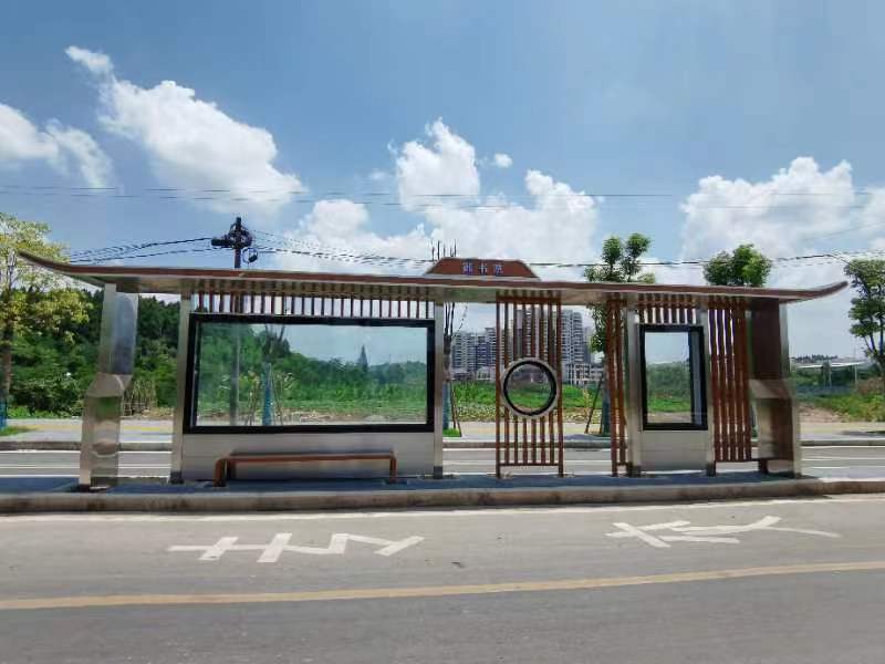 遂寧新型不銹鋼公交站臺設計方案,以不銹鋼和木紋材質為肌理,結合現代、古樸的造型特點,融合地域特色,體現布局通透、明朗的驛站風景。不再是過去單一單調的以廣告燈箱為主的站臺風格。